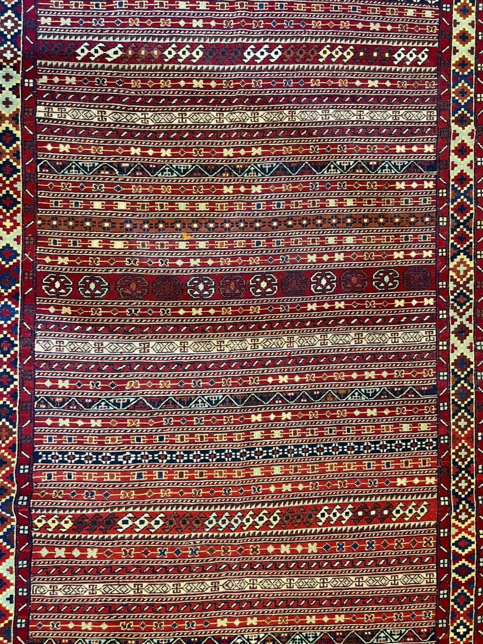 هذه السجادة المميزة من نوع كليم سومك مصنوعة يدوياً في المنطقة القوقازية من إيران، المشهورة بتراثها العريق في فن النسيج. نُسجت بعناية من صوف فاخر، وتتميز بتصميم مخطط أنيق تتخلله زخارف هندسية أصيلة، حيكت بدقة متناهية.