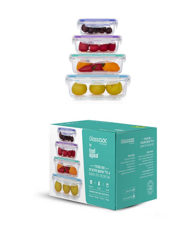 A set of 4 GlassCloc storage boxes made of tempered glass resistant to breakage, heat and cold in a variety of sizes from Food Appeal A set of quality storage tools from Food Appeal – with a fancy lid for easy closing and maximum sealing, made of tempered glass that is the most resistant to heat and cold.